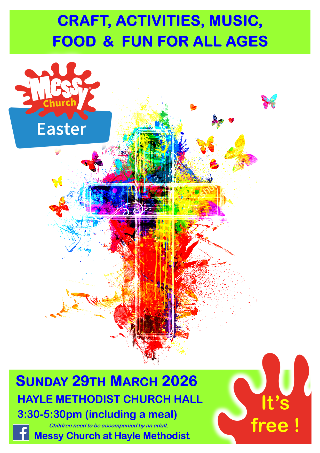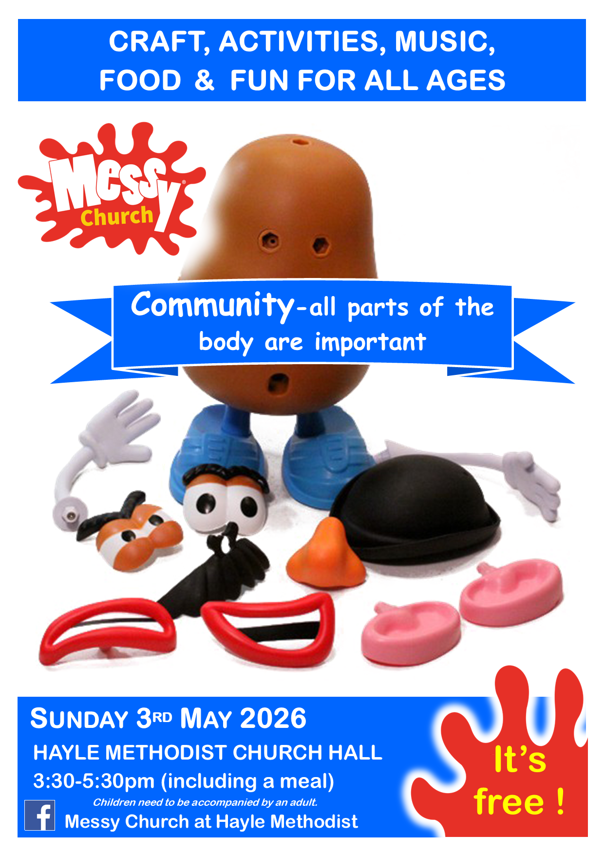 Messy Church takes place on the first Sunday of each month, from 3.30-5.30pm. Its for all the family, including little ones of all ages, and bigger ones (of all ages!!). A meal is provided and there will be lots of fun activities, including craft and games.